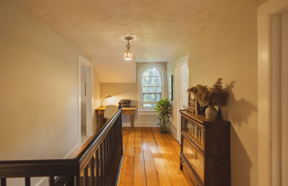 Meanwhile, the upper level is appointed with four large bedrooms, each with views of the picturesque property below. A sweet nook at the end of the hall provides the perfect backdrop for a work-from-home desk or antique standing shelf.
