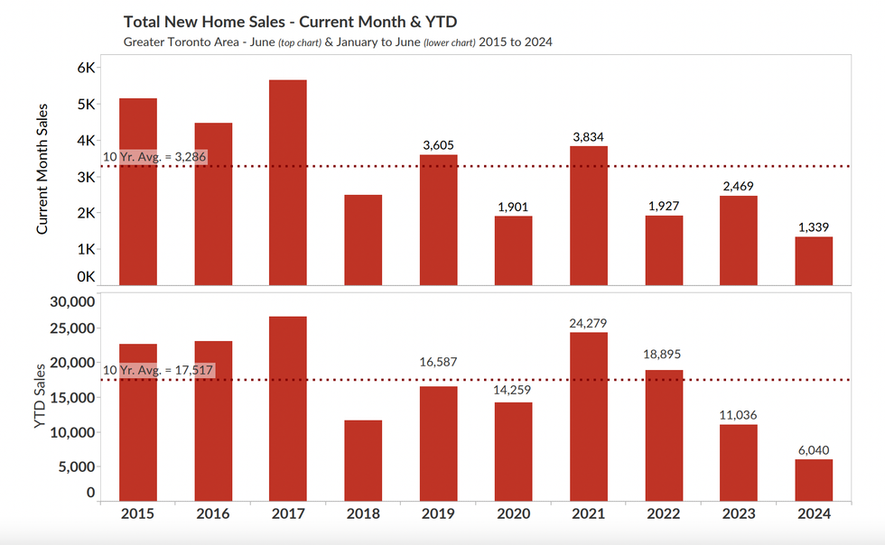 Of the 1,339 new homes sold, sales were roughly split between condominium apartments and single family homes, with the former accounting for 732 units sold and the latter making up 607 units sold. This brought condo sales down 61% from June 2023 and 68% below the 10-year average, while single family home sales ticked up 5% from June 2023, though still 38% below the 10-year average.