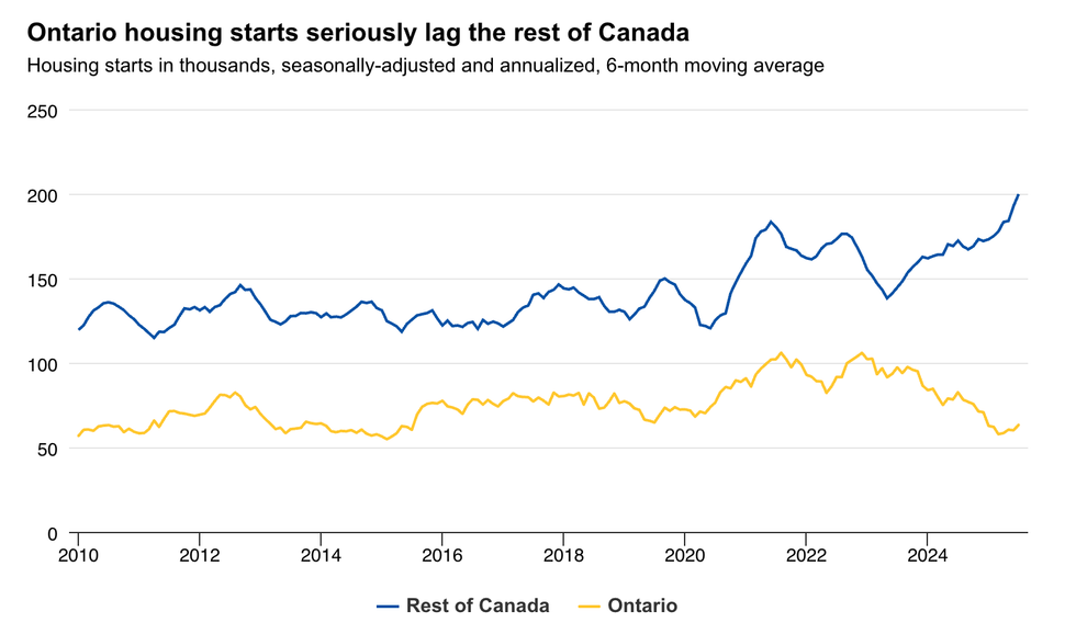 Meanwhile, a new report released Wednesday by economists at RBC further points out that while starts are up nationally, construction in the country's most populated province is sorely down.