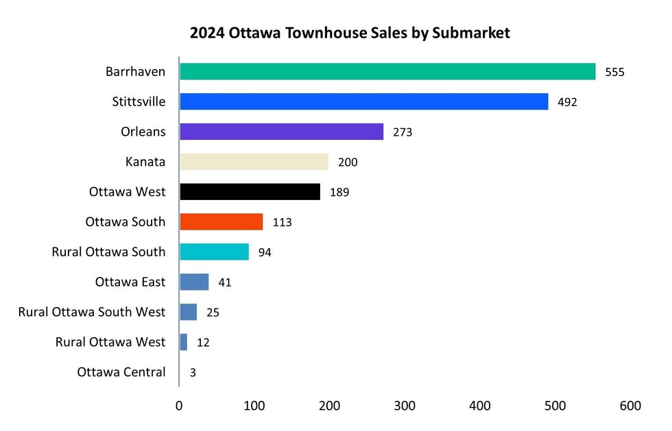 As for what led the increase in townhome sales, a number of master-planned communities, including 14 townhome developments, in Ottawa’s west and southwest raked in the sales. Developments in Barrhaven and Stittsville, for example, accounted for 52% of all 2024 townhouse sales, with a further quarter of activity found in Kanata and Orleans.