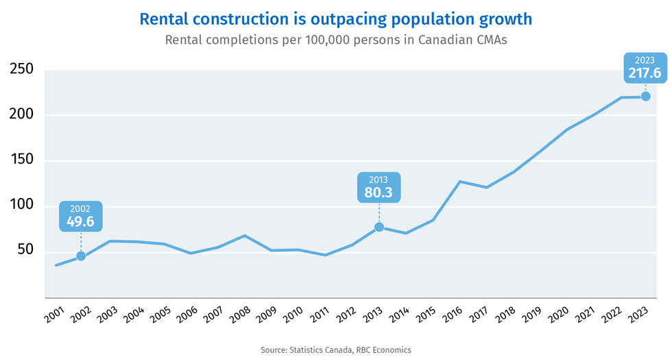 Battaglia discussed the fact that rental starts — so, purpose-built rentals, as well as condo apartments and secondary suites — are accounting for an increasing share of overall housing starts in Canada in a July 3 report as well. At that time, she noted that rental housing starts came in around 80,000 per year in 2022 and 2023, “nearly doubling the average pre-pandemic (2015–2019) annual increase.”