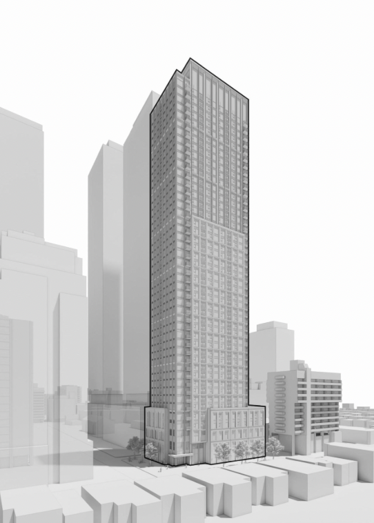 Planned for the 22,507-sq.-ft site is the demolition of the existing structures to be replaced by a building designed by Sweeny&Co Architects featuring a five-storey podium and 40-storey tower element constituting 354,132 sq. ft. At grade, you would find a 4,628-sq.-ft Privately-Owned Publicly Accessible Space (POPS) along Soudan and Brownlow that, according to the application's planning rationale, would provide "a publicly accessible amenity and seating areas, enhancing the public realm."