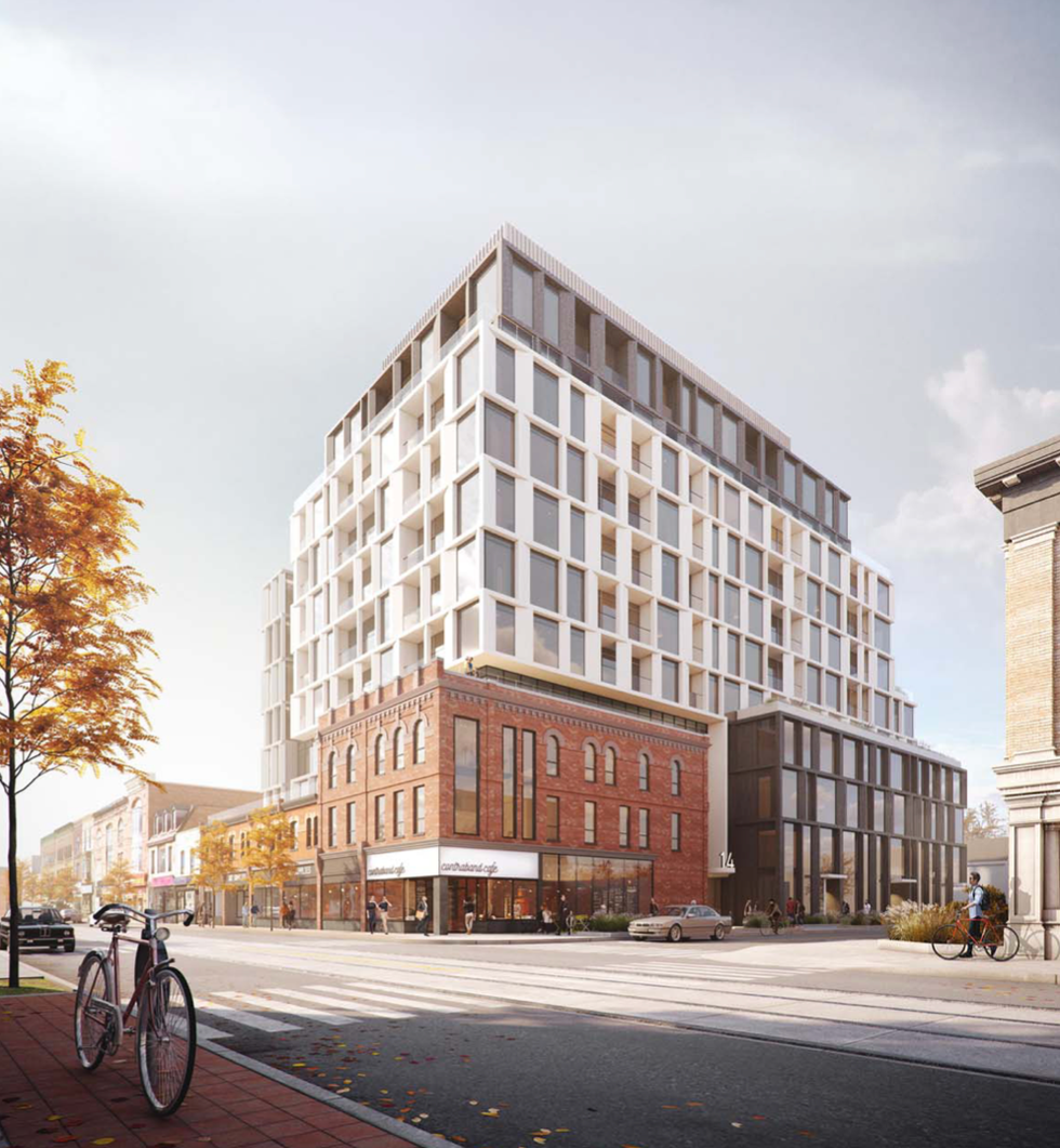 View of proposed development from Queen and Brock, looking northwest. (Giannone Petricone Associates)