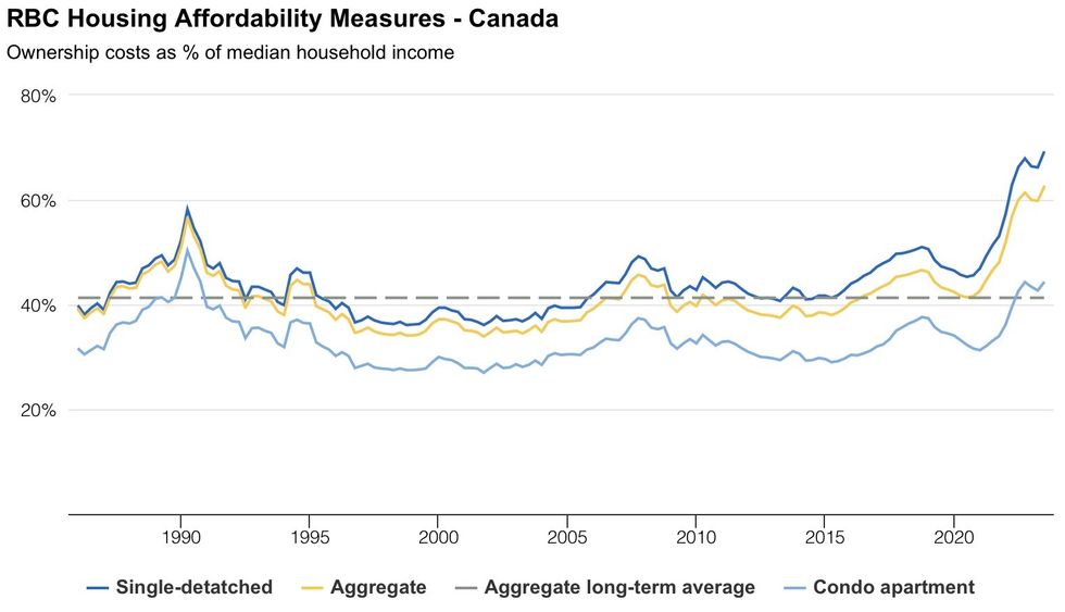 In Vancouver, an entire median household income can no longer cover the costs of owning an average home, with RBC’s aggregate affordability measure rising to an "astounding" 102.6%.