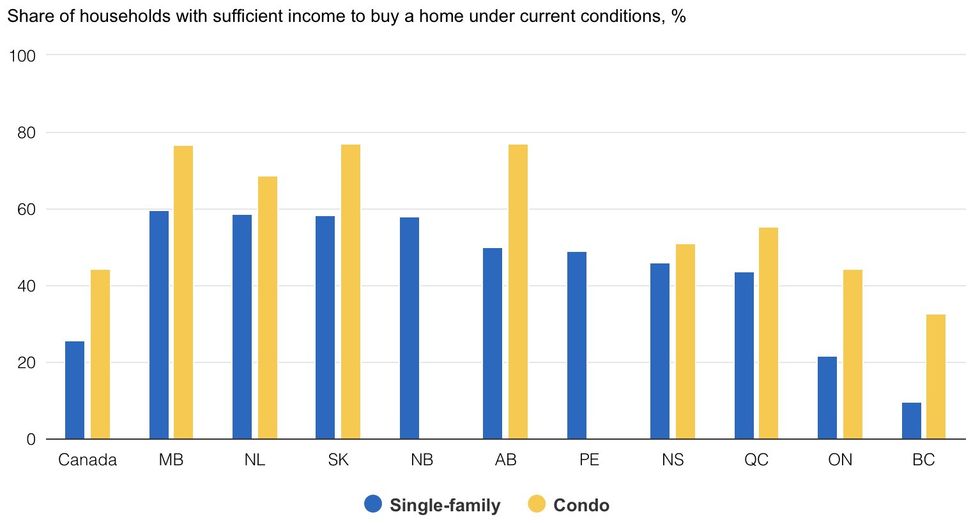 On a provincial basis, more than 75% of households can afford to own a condo in Manitoba, Saskatchewan, and Alberta, as can more than 50% of households in Quebec, Nova Scotia, and Newfoundland and Labrador. The figure falls below 45% in Ontario, and below 33% in British Columbia.