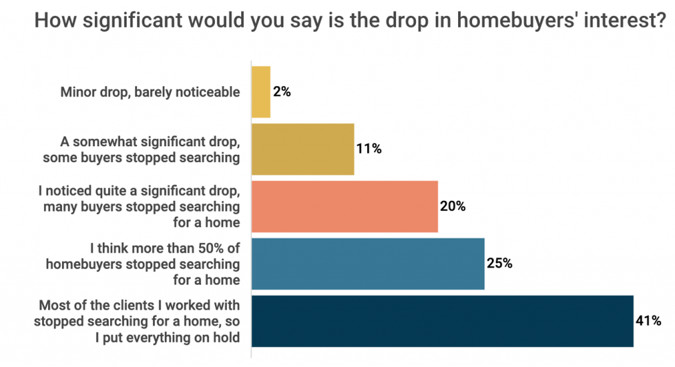 According to Point2 Homes, 86% of the agents who responded said they have noticed a significant drop in homebuyers' interest. Of these respondents, 41% said that most of their clients stopped searching for a home, so they were forced to put everything on hold, while only 2% of agents said that, so far, they've only noticed only a minor drop in interest.