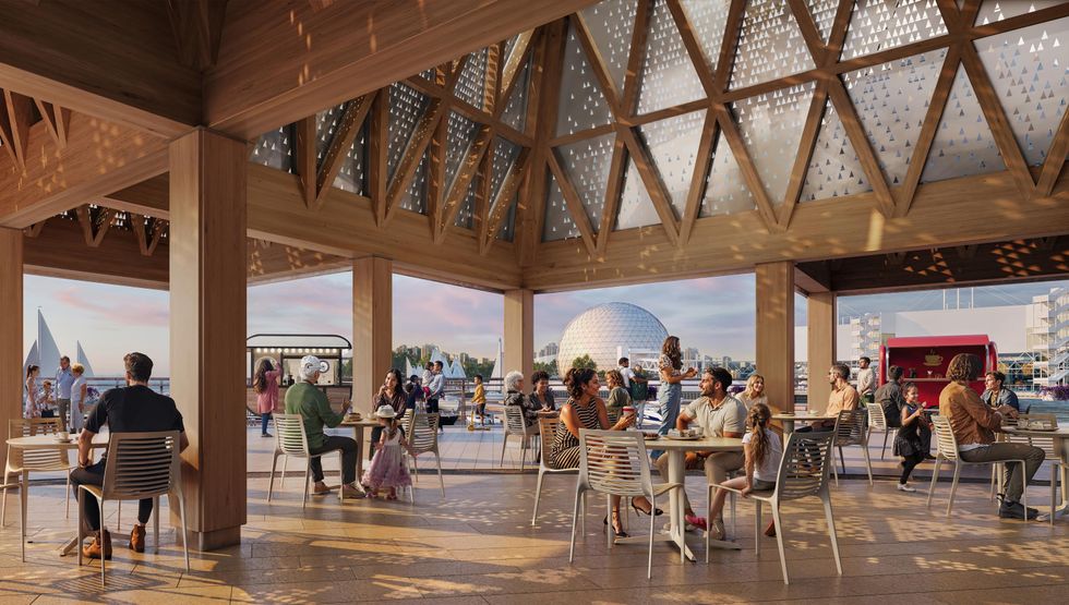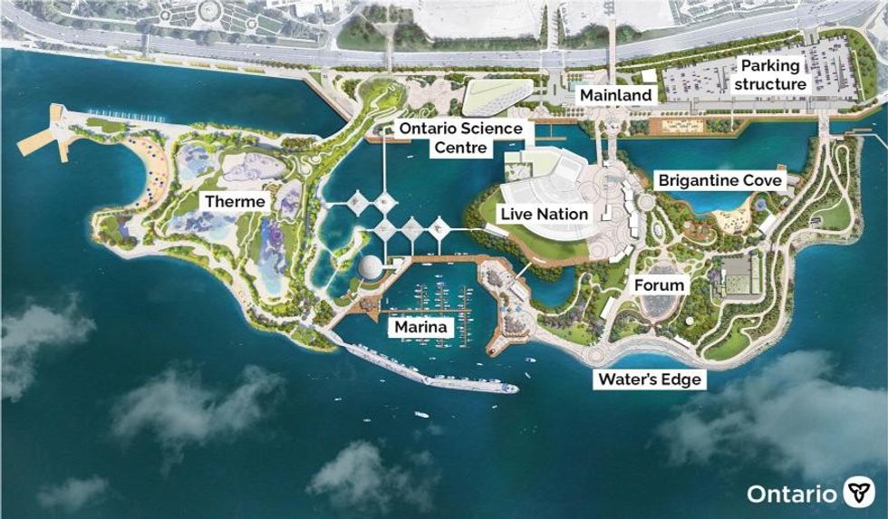 The park's new design will consist of five distinct zones: The Forum, The Mainland, The Marina, The Water’s Edge, and Brigantine Cove. Highlights of the redevelopment include a new entrance with a 3,500-spot parking structure expected to bring in $60 million in revenue per year, a new Brigantine Cove with a multi-level interactive treehouse, a new forum space for outdoor markets and festivals, a 3,400-sq.-ft Indigenous Cultural Pavilion, Live Nation’s revitalized year-round amphitheatre, and the relocation of the beloved Ontario Science Centre.