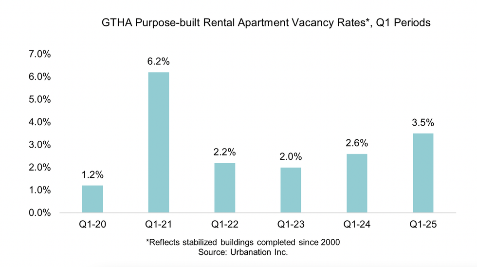 In Toronto, vacancy rates reached 3.7% in Q1-2025, according to data from Urbanation, and rents have fallen 5.5% on a year-over-year basis to $2,606 as of May, according to data from Rentals.ca and Urbanation.