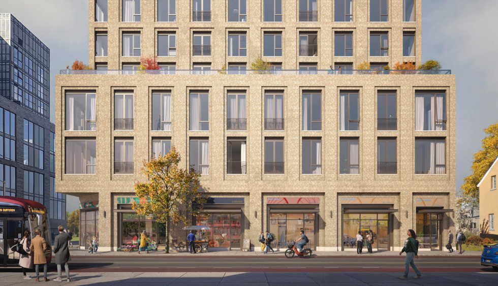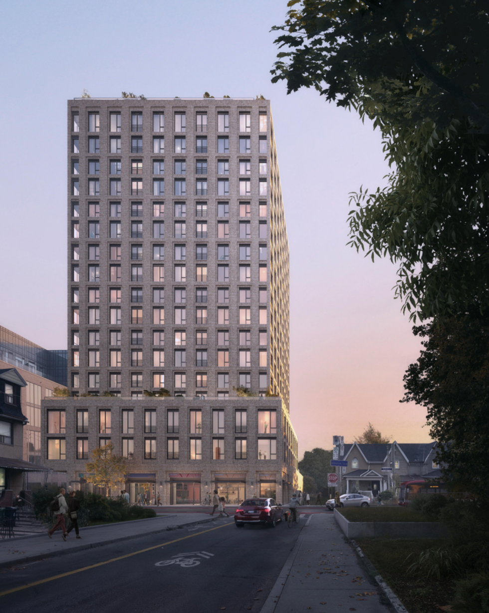 Designed by Toronto-based architecture firm Superkül, the updated design features a handsome facade with light-coloured brick and large storefront windows at grade. A pleasant rooftop patio crowns the three-storey podium from which the simplified tower sprouts. Along with the tower, the development plans call for new trees along the street, and a wider sidewalk.
