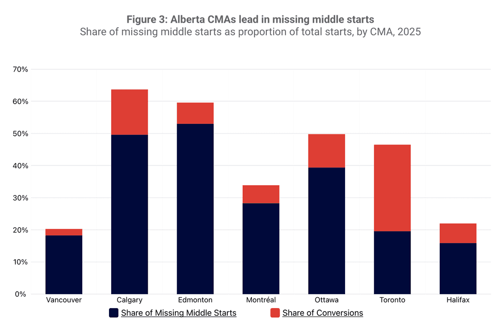 This form of housing has grown steadily in most major cities since 2018. Calgary and Edmonton led the trend in 2025, with about 60% of new housing starts falling into the missing middle category, largely made up of row houses and townhomes. Toronto followed at roughly 50%, with more than half of those units coming from conversions of existing buildings.