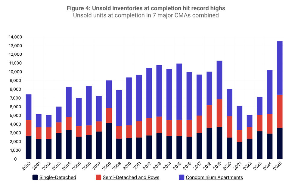 While construction activity remained resilient overall, the report highlights growing concerns about the future pipeline of ownership-oriented housing, as condominium presales weakened sharply and unsold inventories climbed across several markets.