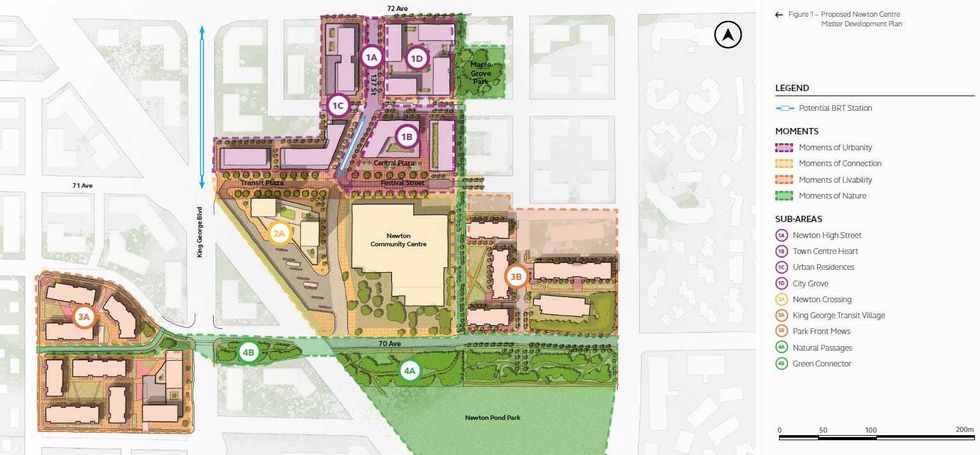The Newton Centre Master Development Plan outlines a vision for just under 41 acres of public land along King George Boulevard near 72 Avenue, a few blocks south of the King’s Cross Shopping Centre and just north of the 6.2-acre Newton Pond Park.