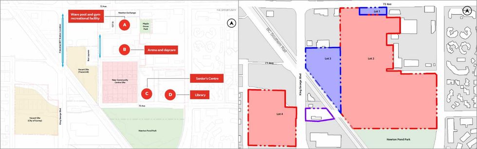 The City of Surrey owns about 35.4 acres including a large vacant site on the western side of King George Boulevard, a 28-lot land assembly immediately north of Newton Pond Park, as well as an existing seniors centre, library, arena, and recreation centre. All of the facilities were built over 30 years ago. TransLink owns the remaining 5.5 acres, including a vacant 5-acre site along King George Boulevard.