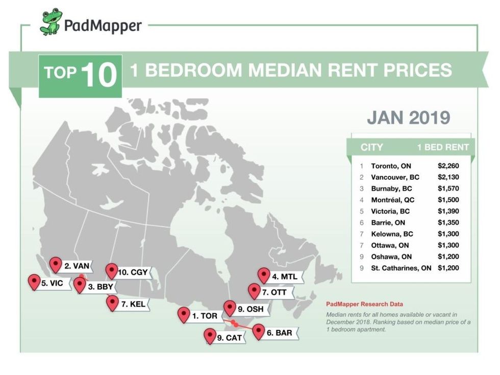 In Toronto, the average cost of rent for one and two bedroom units held steady at $2,260 and $2,850 respectively. Toronto is still the most expensive city in the country for renters.