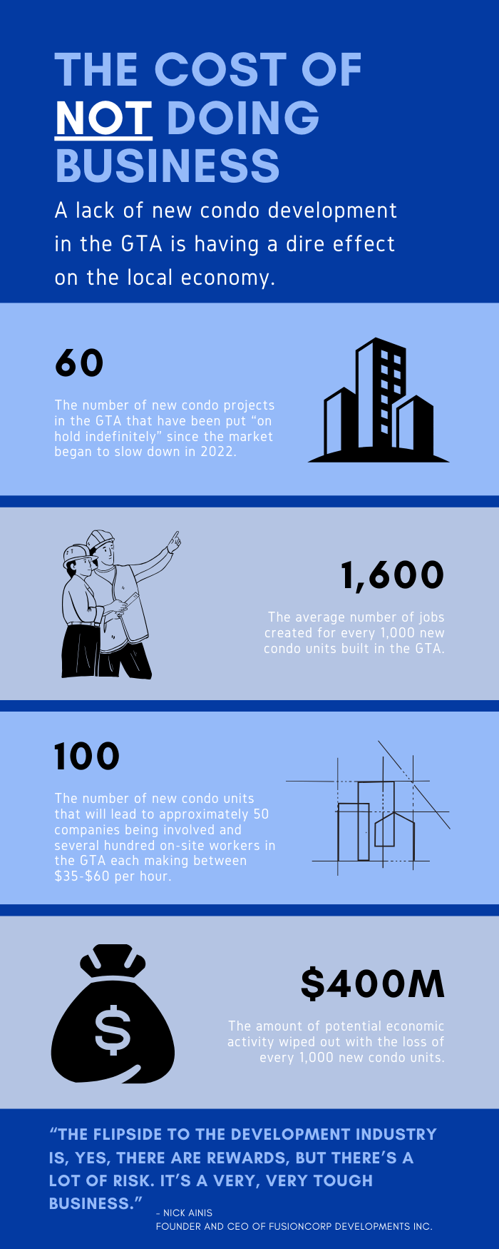 On a single job site, Nick Ainis’s construction-management business employs hundreds of sub-contractors. Combined, his army of trades can log upwards of a hundred thousand well-paid hours putting up a mid-sized condo building. But, as developers delay project launches in response to the higher interest rates that have pushed away potential homebuyers, he and his labourers see their prospects in the formerly booming market dwindle. “It’s hard to get new work in this environment, because everybody’s holding off,” says the founder and CEO of Fusioncorp Developments Inc., a construction-management company.