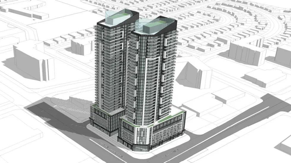 In aim of redeveloping the commercial plaza that currently occupies this central Scarborough site with an intensified residential development, the developer behind this proposal is envisioning a 37- and 38-storey mixed-use development that would deliver 740 condo units and contain a large central courtyard amenity space.