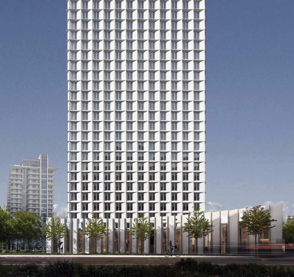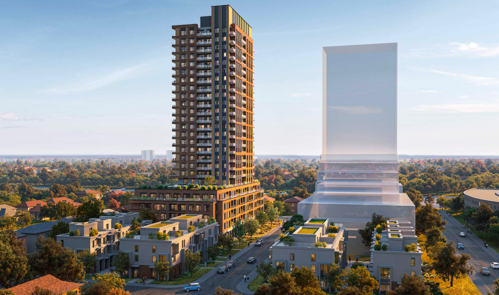 Redevelopment plans for 123 Parkway Forest Drive — currently occupied by a 19-storey apartment and three rental townhouses — date back to August 2021, at which time a 29-storey replacement was proposed, which would include five townhouse units within the podium. The proposal, which comes from Choice Properties REIT on behalf of Emerald GP Inc. as general partner for Emerald Limited Partnership, was revised twice more, and its latest form calls for a 33-storey apartment with 384 rental units. Of those, six would be affordable rental housing units, and 193 units are to be secured as rental housing for 20 years to compensate for the existing rentals on the site. The proposal also calls for a unit breakdown of 58 studios, 198 one-bedrooms, 81 two-bedrooms, and 47 three-bedrooms.