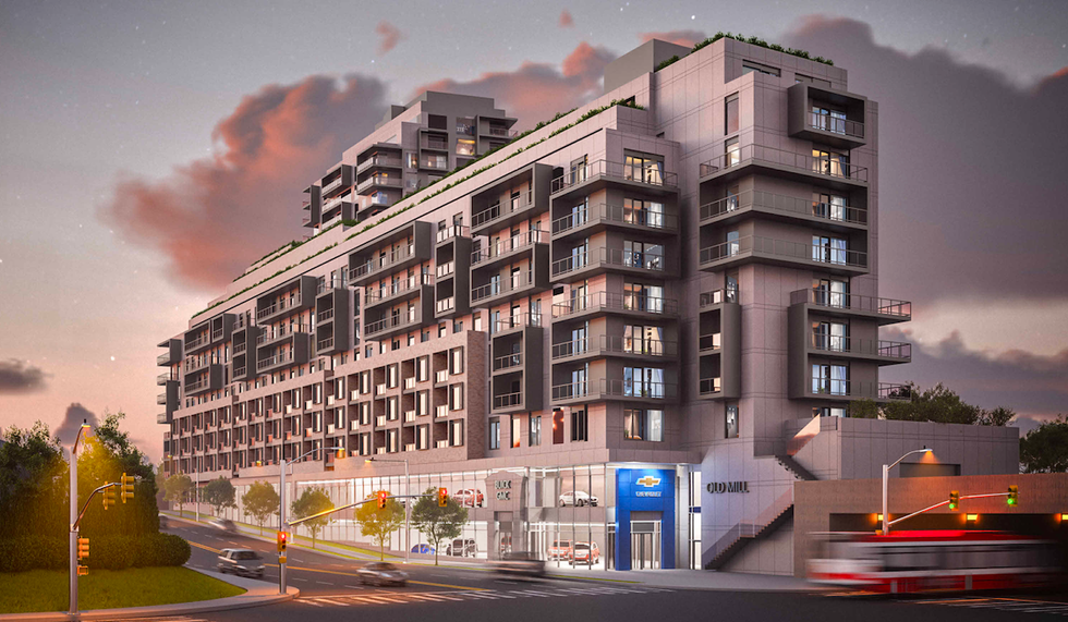 Plans to redevelop a two-storey vehicle dealership building and surface parking lot at 2595 St. Clair Avenue West were filed with the City on behalf of Old Mill Cadillac Chevrolet Buick GMC Ltd. in January 2024, and those call for a mixed-use development consisting of an 11-storey mid-rise that connects to a 20-storey tower. The building form is essentially ‘L’ shaped, and would accommodate a commercial component on two floors, and 505 residential units. Of the total units, 345 would be studios or one-bedrooms, 111 would be two-bedrooms, and 49 would be three-bedrooms.
