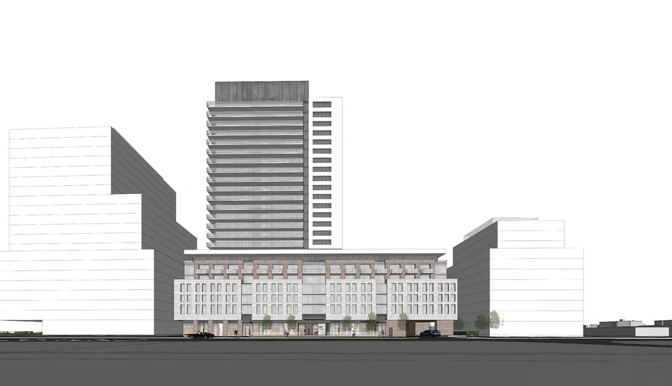 Following an initial submission in June 2023 calling for 48, 32, 12, and seven storeys, plans to redevelop a site partially occupied by a women’s shelter known as Elisa House (60 Newcastle) were resubmitted to the City in October 2024 and now call for 46, 32, 14-storey, and seven storeys. The proposal comes from Diamante and further specifies that the 46- and 32-storey buildings would be connected by an eight-storey podium, and would contain residential, retail, office, and daycare uses. The 14-storey building would also include retail, as well as affordable housing through a rental co-op model. The seven-storey building would replace the shelter and supportive housing services provided by Elisa House. Across the three high-rises, a total of 1,117 residential units are proposed (47 studios, 758 one-bedrooms, 217 two-bedrooms, and 95 three-bedroom units), and 36 supportive dwelling units, 16 emergency shelter beds and 72 shelter beds are proposed within the mid-rise.
