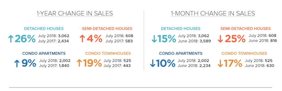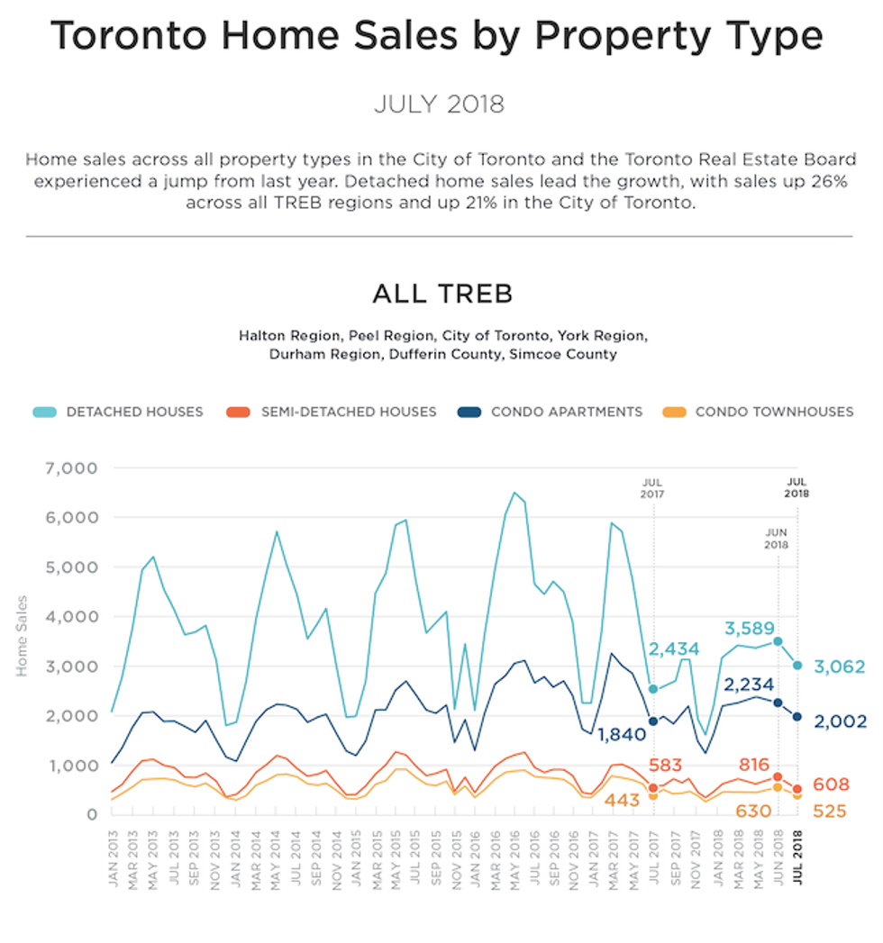 The average property price rose 4.8 per cent to $782,129 from July 2017 and sales increased 18.6 per cent across the Greater Toronto Area.
