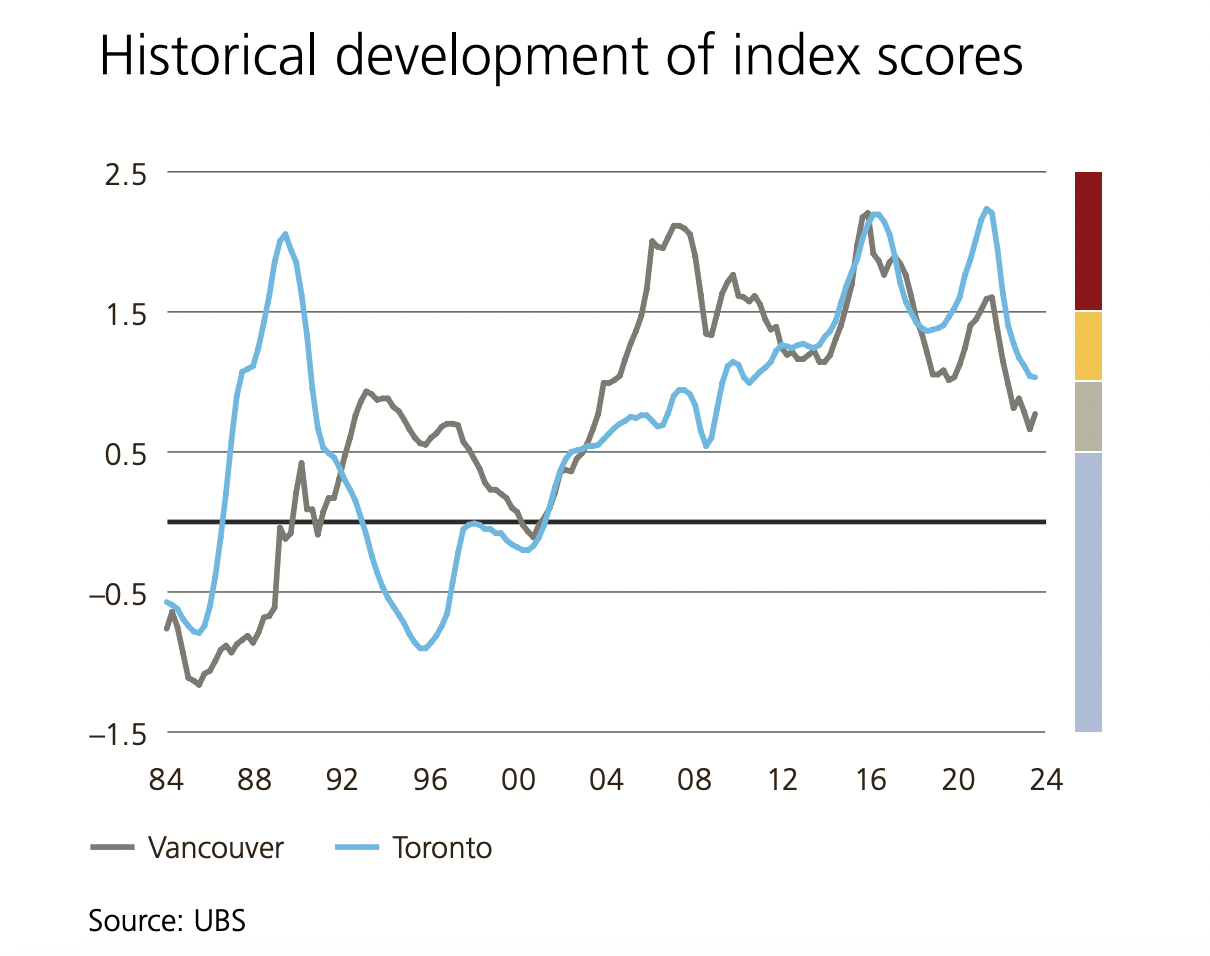 Toronto's housing bubble score ticked down from 1.21 in 2023 to 1.03 in 2024, though slower rent and income growth, compared to cities like Vancouver, have kept the city in "elevated" risk territory.
