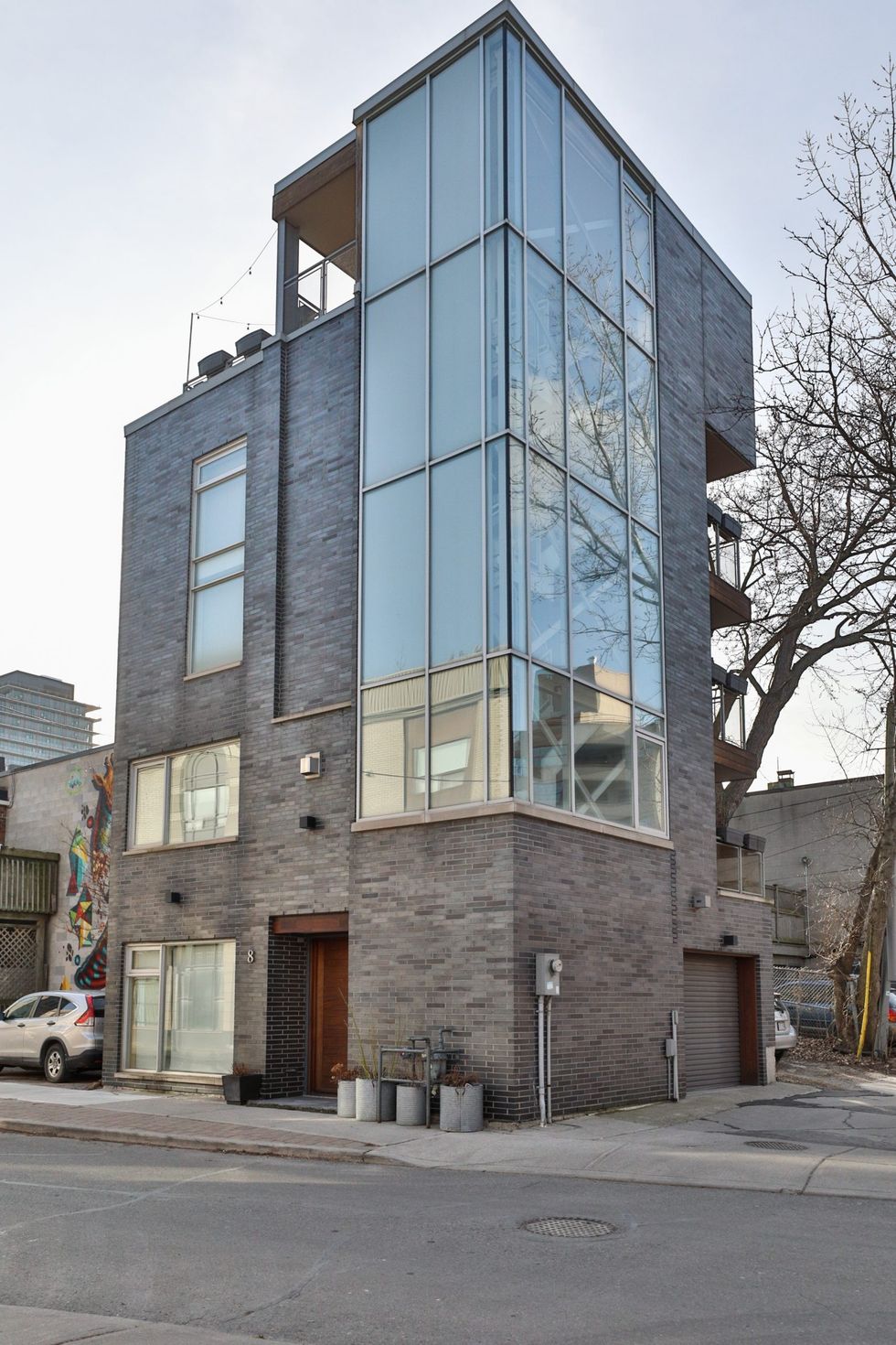 Located at 8 Trefann Street in Corktown, the 3-storey home features reclaimed marble from First Canadian Place, old-growth timber from Georgia Bay, and a solid steel frame, which can be seen through the tall glass atrium that spans most of the north wall of the tower, flooding the home with natural light.