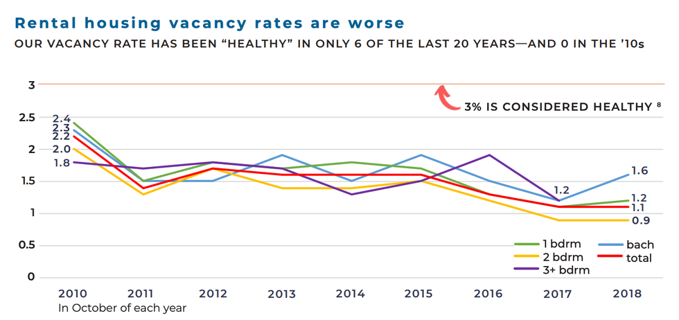 Moreover, the report said vacancy rates for available rental units have been at "historic lows," making it hard for renters to find a place to live, much less an adequate and affordable home.
