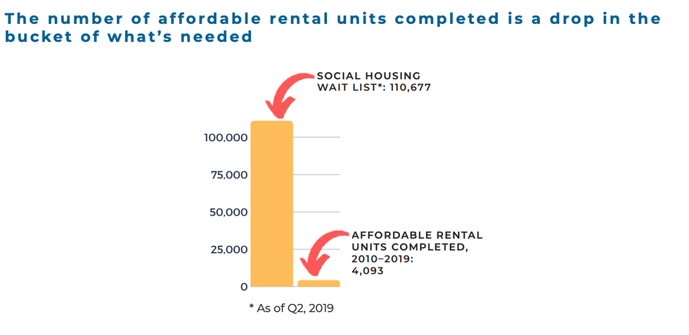 As for affordable housing, over the past decade, the total number of new affordable units built amounts to just 4,093, which Social Planning Toronto described as "hardly a drop in the bucket compared to the real need."