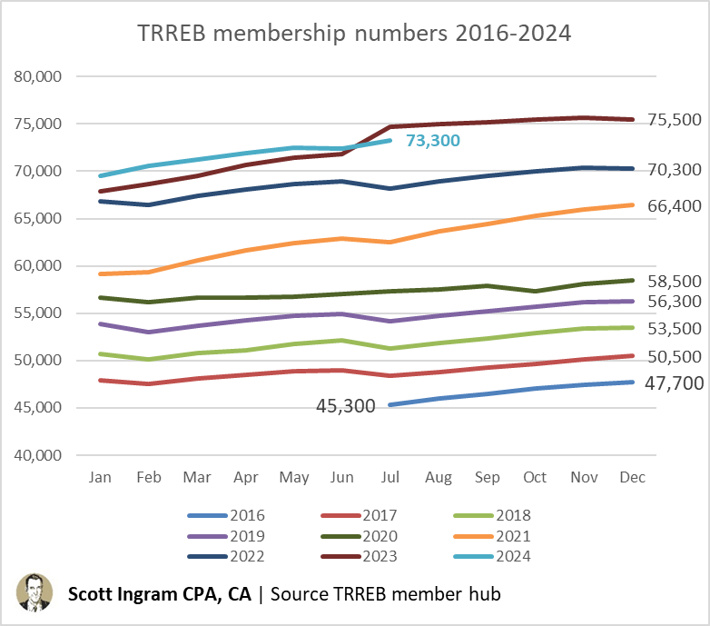 Toronto Regional Real Estate Board (TRREB) memberships declined by 1,363 year-over-year this July to 73,315, marking the first month since 2016, at least, to see a yearly decrease.