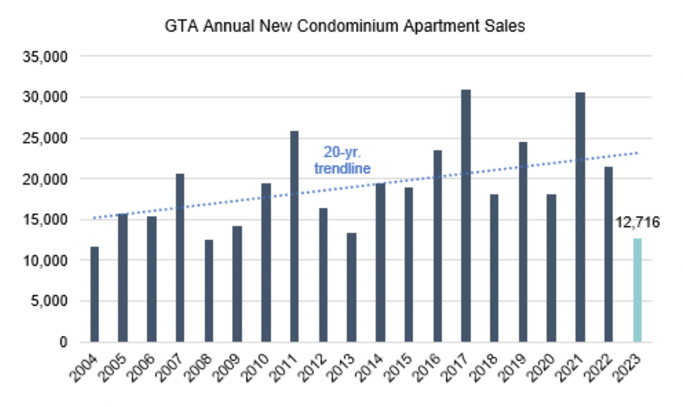 Affordability challenges reverberated through the Greater Toronto Area’s (GTA) new condo market in 2023, and new data shows that buyers simply weren’t biting as the year drew to a close.