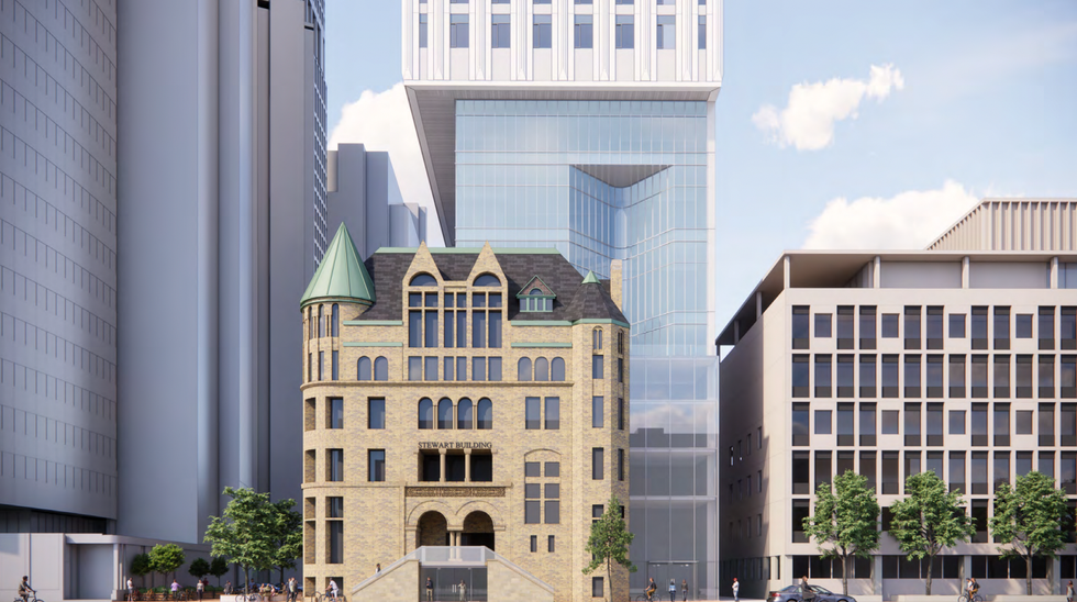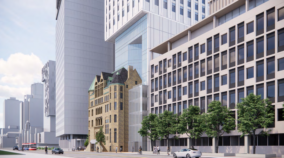 The development is defined by the ambitious addition of residential space above the Stewart Building, making use of valuable airspace while maintaining the structure's historical integrity. "The proposed development will not only enhance and provide significant public realm improvements to this segment of College Street, it will also introduce appropriate transit supportive densities that support the growing need for housing in the city," says the Planning Rationale.
