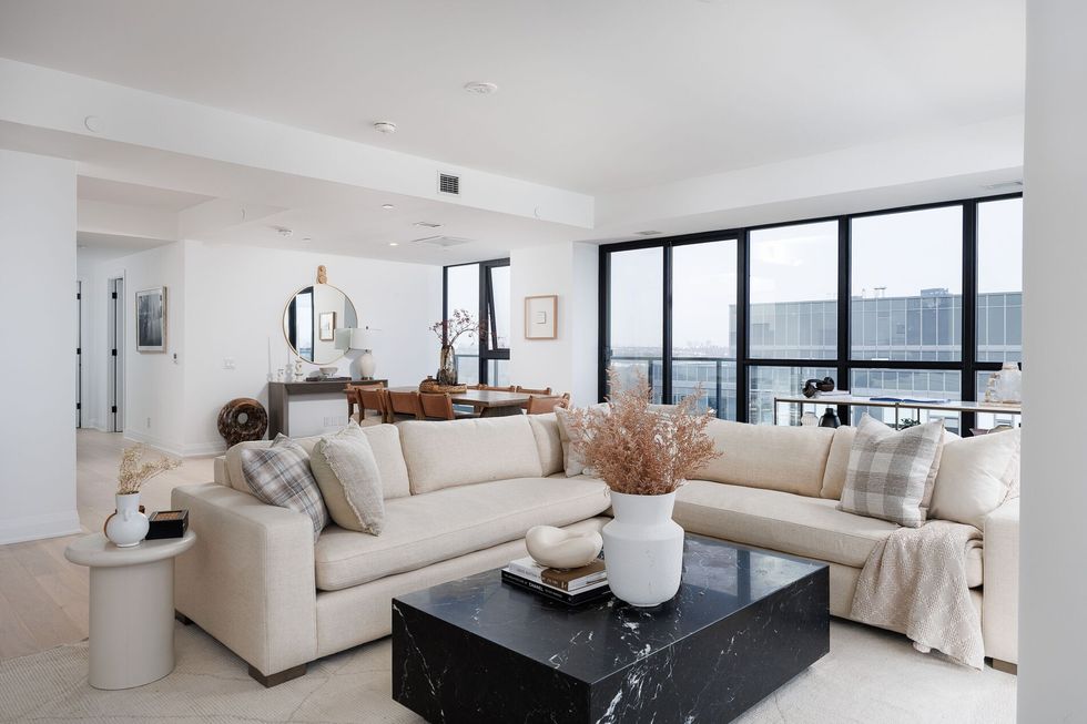 Ten-foot ceilings and floor-to-ceiling windows frame breathtaking city views, while luxe finishes — including Calacatta marble, fluted millwork, and custom black granite archways — punctuate the space.